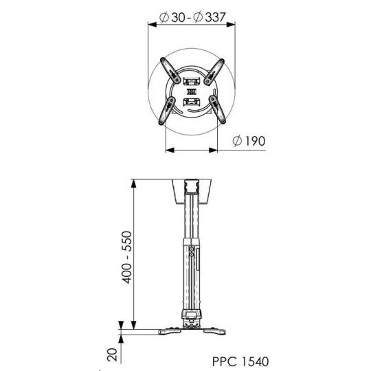 - 4 nastavitelná montážní ramena s dosahem 30-337 mm