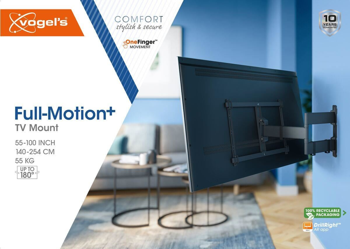 S tímto stylovým nástěnným držákem řady COMFORT Full-Motion+ si můžete sledování svého velkého televizoru maximálně užít. TV 3843 se může otáčet až o 180° a naklánět až o 10° pro optimální pohodlí při sledování. Je navržen pro intenzivní používání, takže je ideální pro rodiny s dětmi. Váš televizor bude zaručeně bezpečně a spolehlivě upevněn. Držák je vhodný pro televizory s úhlopříčkou 50 až 100 palců a hmotností do 55 kg.