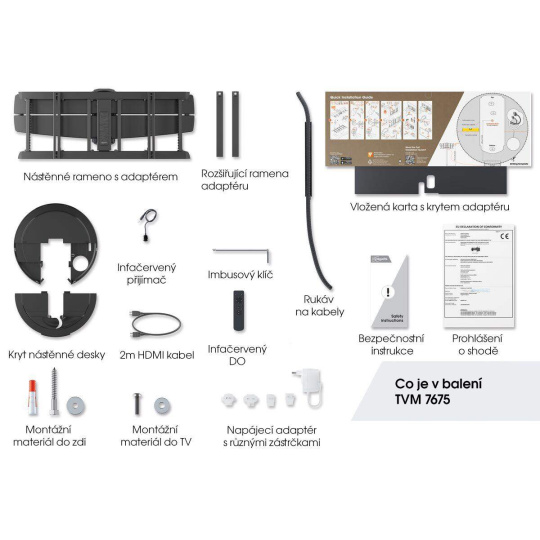 - tenký 4,5metrový kabel HDMI (při použití držáku MotionMount v kombinaci s TV s externím přijímačem (např. Samsung s One Connect Box)