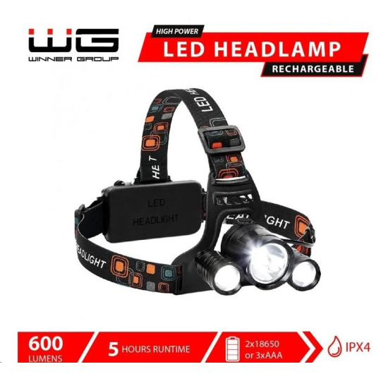 Vynikající, moderní a vysoce účinná čelovka od společnosti Winner Group bude skvělým společníkem při venkovních aktivitách. Je určena pro individuální použití ve tmě nebo v interiéru bez osvětlení. Čelovka vám skvěle poslouží při nejrůznějších dobrodružstvích jako je kempování, sportovní aktivity, noční rybolov, či prozkoumávání tajných chodeb a jeskyň. Kompaktní čelovku si můžete vzít prostě kamkoli, vejde se do batohu i kapsy. Čelovku si nasadíte na hlavu a rázem máte obě ruce volné a můžete je bez omezení používat. Díky možnosti nastavení předních světel směrem dolů až o 105° můžete upravit úhel světla podle vašich potřeb, aby světlo dopadalo přesně na požadované místo. Světlo má jas 600 lumenů a jeho dosah je 300 metrů. Výhodou této čelovky je, že si můžeme vybrat ze dvou variant napájení. Buď použijeme klasické tužkové baterie AAA, které po dosvícení vyměníme za nové, nebo můžeme použít baterie 18650, které po dosvícení dobijeme pomocí přloženého kabelu Micro USB.