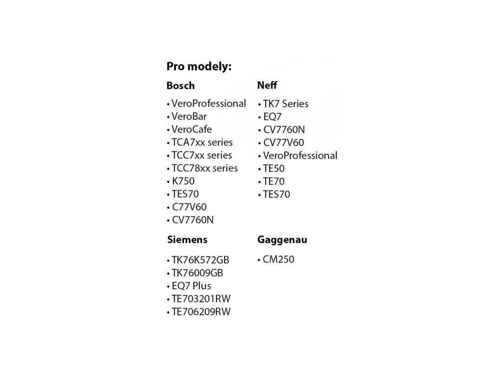 - Kompatibilita: Vhodný pro širokou škálu plnoautomatických kávovarů značek Bosch, Siemens, Gaggenau a Neff.