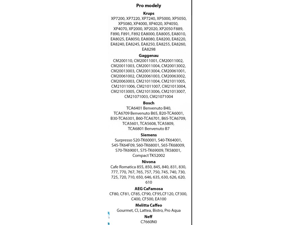 Kompatibilita: Krups, Bosch, Siemens, AEG, Gaggenau, Nivona, Melitta, Neff - viz.obrázek v příloze.