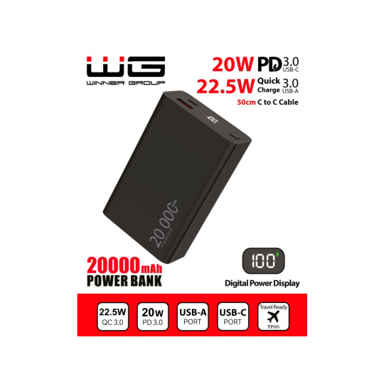WG - Power Bank 20000 mAh, USB-C PD 20W + USB-A QC 22.5W, černá