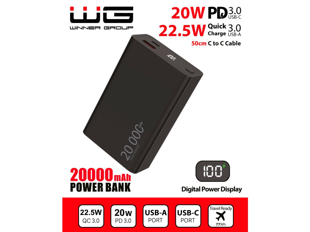 WG - Power Bank 20000 mAh, USB-C PD 20W + USB-A QC 22.5W, černá