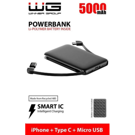 WG - Power Bank 5000 mAh, kabel Micro USB + Type-C + adaptér Lightning, černá