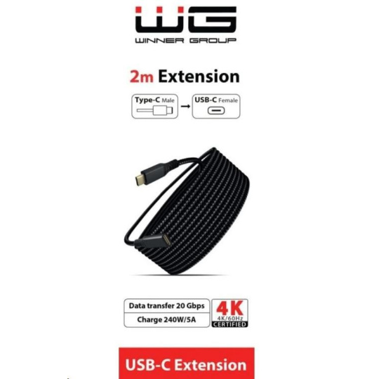 WG - Prodlužovací kabel USB-C (male) na USB-C (female), 2 metry, nylonový oplet, černá