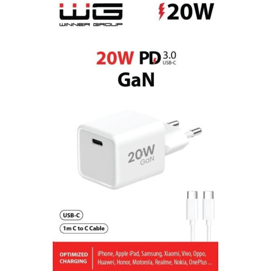 WG - Síťová nabíječka 1x USB-C PD 20W, 5V-9V-12V, kabel Type-C na Type-C, bílá