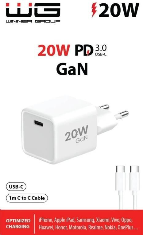 WG - Síťová nabíječka 1x USB-C PD 20W, 5V-9V-12V, kabel Type-C na Type-C, bílá