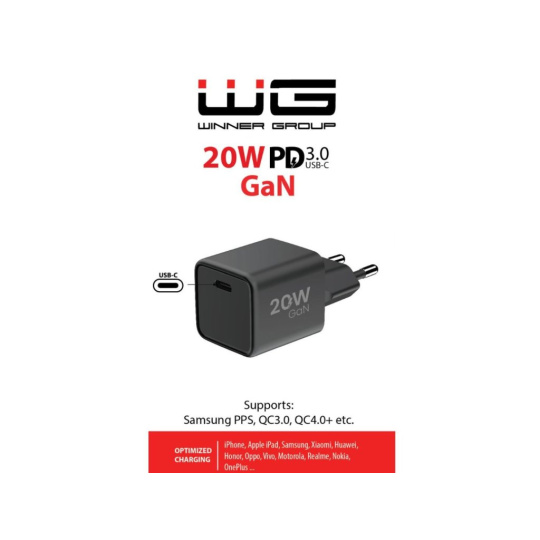 WG - Síťová nabíječka GaN 1x USB-C, PD 20W, 5V-9V-12V, černá