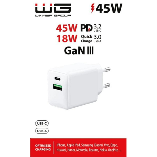 WG Síťová nabíječka GaN 2xUSB (A+C)/USB-C PD45W+USB-A QC3.0 18W/white