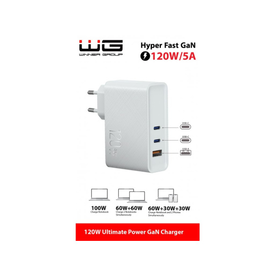 WG - Síťová nabíječka GaN 3x USB 120W, 1x USB-A + 2x USB-C, bílá