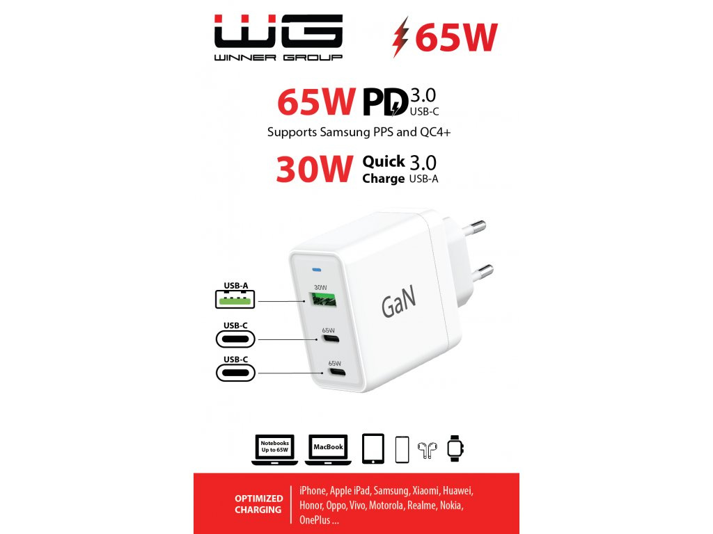 WG - Síťová nabíječka GaN 3x USB, 1x USB-A 30W + 2x USB-C 65W, bílá