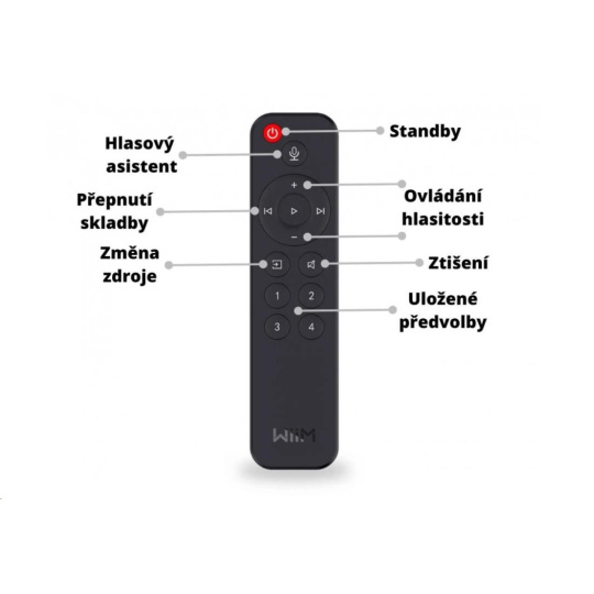 Dálkový ovladač pro Hi-Res audio streamery WiiM. Podpora funkcí: zap/vyp, ovládání hlasitosti, play /stop, posunutí skladby, přepnutí vstupu, mute, hlasový asistent, předvolby 1-4..