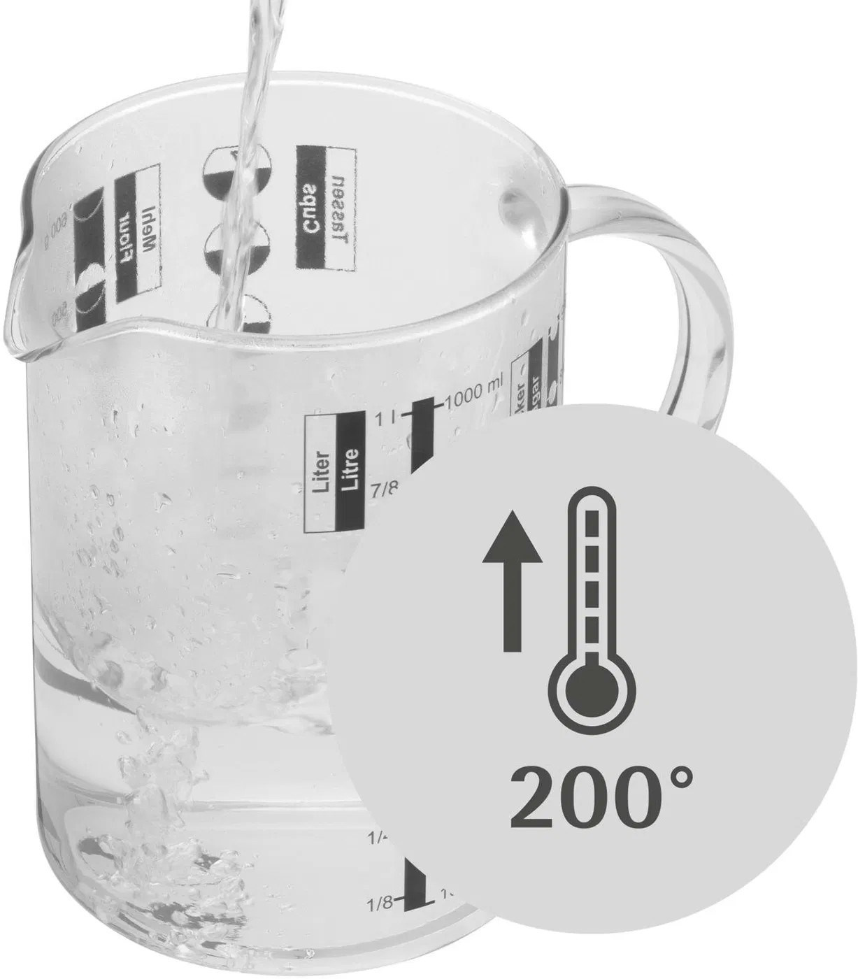 - Tepelně odolné sklo: Vyrobeno z vysoce kvalitního skla, které odolává vysokým teplotám, což umožňuje odměřování horkých tekutin přímo z hrnce.