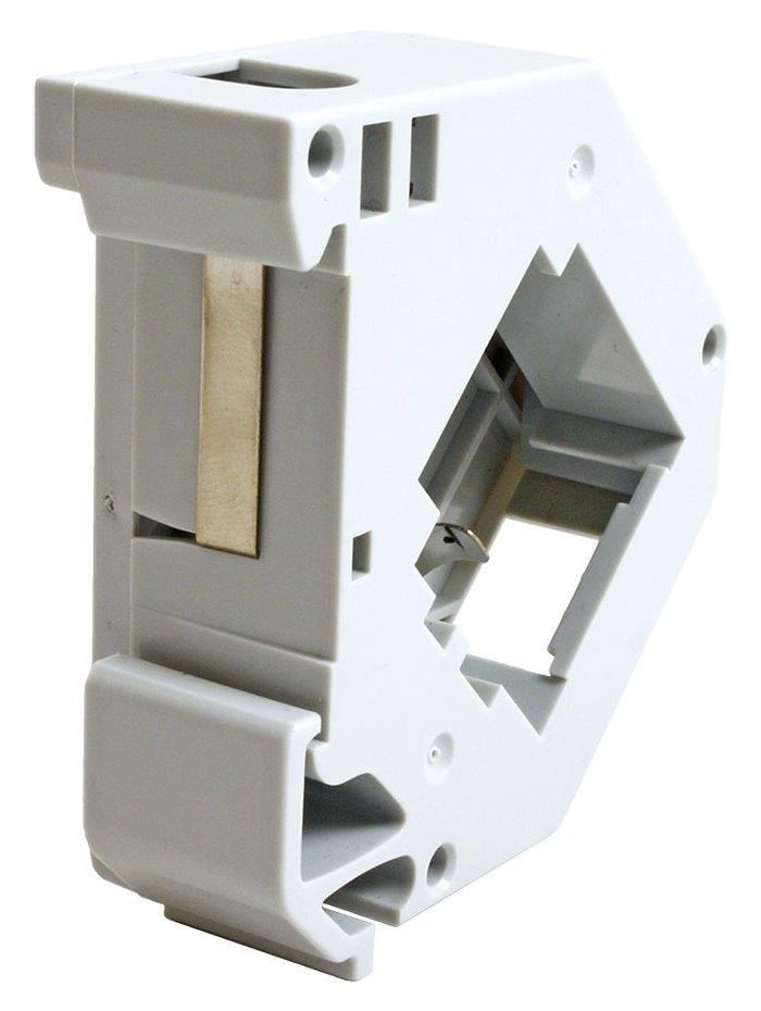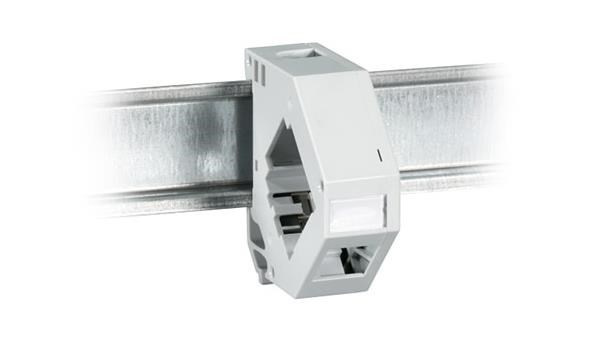 Plastový držák pro 1 keystone na DIN lištu. Integrovaný kovový pásek zajišťuje uzemnění keystone modulu. Štítek pro popis (vyjímá se po sejmutí bočního krytu)..