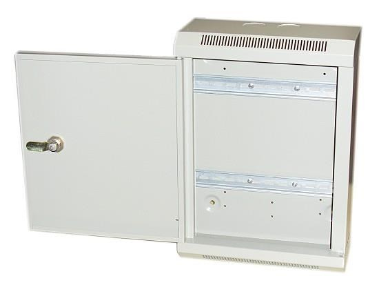 Kovový rozvaděč pro vnitřní instalace s DIN lištou. Rozvaděč je opatřen kovovým zámkem a ventilačními otvory.