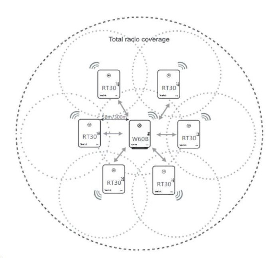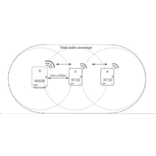 Repeater je vhodný pro rozšíření pokrytí stávající či nové DECT sítě. K jedné základně může být připojeno až 6 repeaterů a ve spojení s W60B podporuje kaskádování dvou RT30. Na repeateru je možné uskutrečnit 2 souběžné hovory. Repeater Yealink RT30 je vybaven třemi LED diodami pro okamžité zjištění stavu. Dosah DECT signálu do 50m vnitřní a do 300m venkovní prostory. Napájecí adaptér 5V DC, 0,6A je součástí balení..