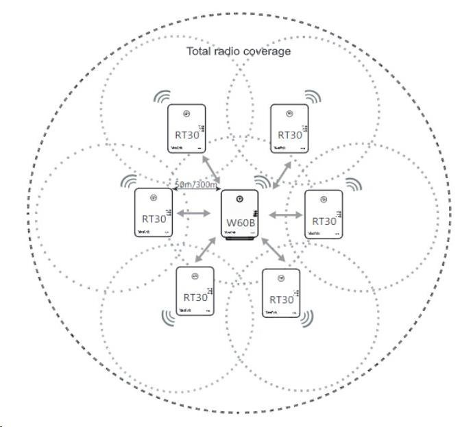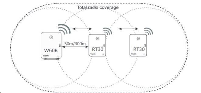 Repeater je vhodný pro rozšíření pokrytí stávající či nové DECT sítě. K jedné základně může být připojeno až 6 repeaterů a ve spojení s W60B podporuje kaskádování dvou RT30. Na repeateru je možné uskutrečnit 2 souběžné hovory. Repeater Yealink RT30 je vybaven třemi LED diodami pro okamžité zjištění stavu. Dosah DECT signálu do 50m vnitřní a do 300m venkovní prostory. Napájecí adaptér 5V DC, 0,6A je součástí balení..