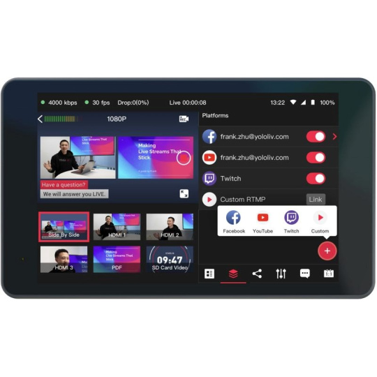 YoloBox Pro je video přepínač, kodér, monitor, rekordér a audio mixer v jednom. Díky vestavěné službě restreaming se nativní podpora integruje přímo s YouTube, Facebook a Twitch. Můžete se jednoduše přihlásit ke svému účtu na sociálních sítích a začít streamovat. V nabídce můžete přidat grafické prvky, jako jsou loga, obraz v obraze, výsledkovou tabulku a rolovací titulky, také komentáře ke streamu, zobrazení vedle sebe, rozdělené zobrazení a mnoho dalšího. Můžete snadno komunikovat se svým publikem v reálném čase díky překrývání komentářů a přizpůsobeným možnostem obrazu v obraze, včetně režimu rozhovoru, upravitelných vestavěných šablon a možnosti nahrát vlastní šablony, čímž přizpůsobíte a vnesete do vašeho streamu vaše vlastní nápady a osobnost.